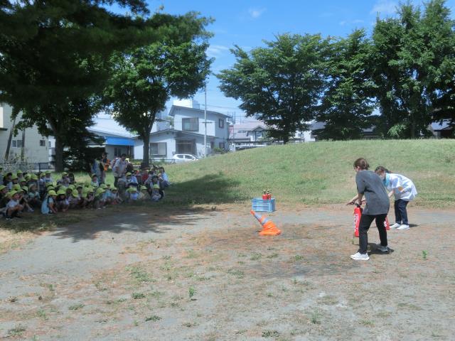 公園では先生方による消火訓練も行い、消火器を使っている先生を見て「頑張れ~」と応援しているお友だちもいました。