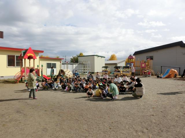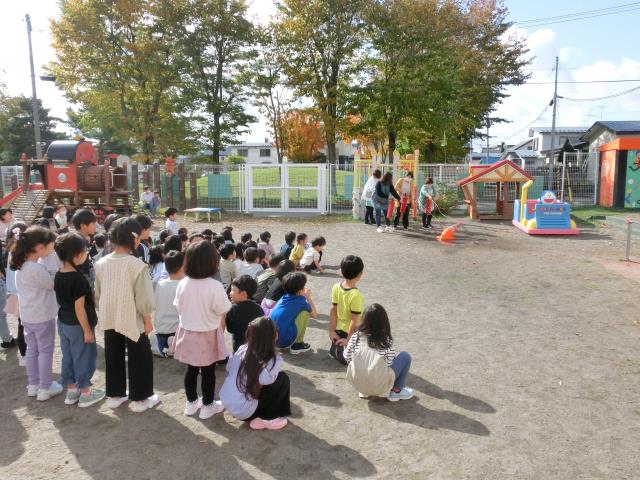 予告なしでベルが鳴ったため、驚いたお友だちも多かったのですが、先生のお話をよく聞いて上手になかよし公園へ避難していましたよ。