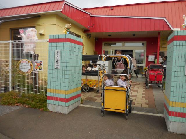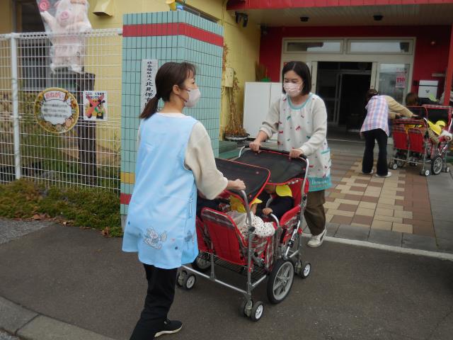 小さいお友だちはお散歩カーやベビーカーに乗っての移動。