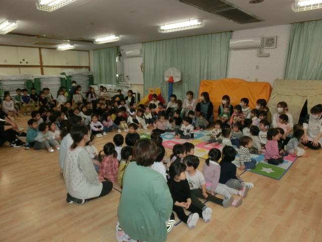 改築工事に伴い大型車が出入りしているため、今月はホールへ避難する練習をしました。