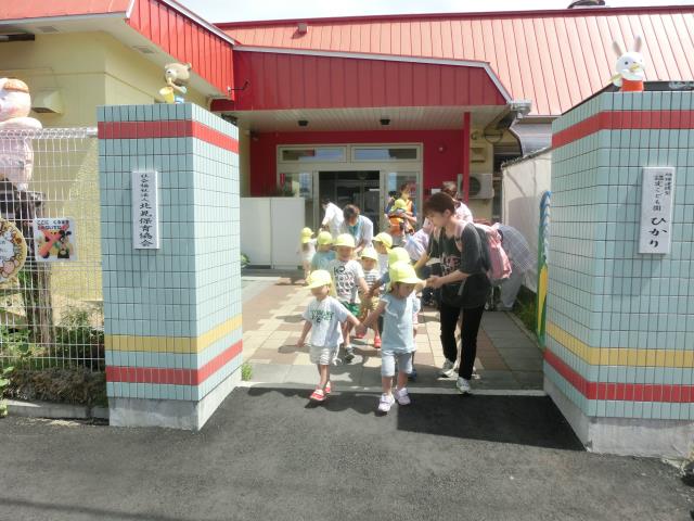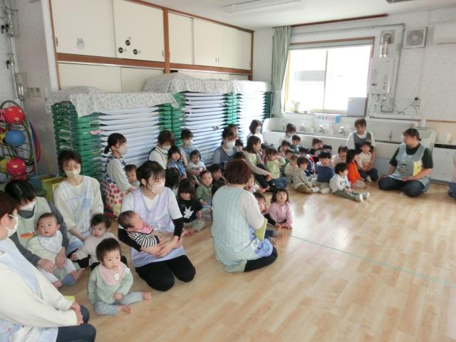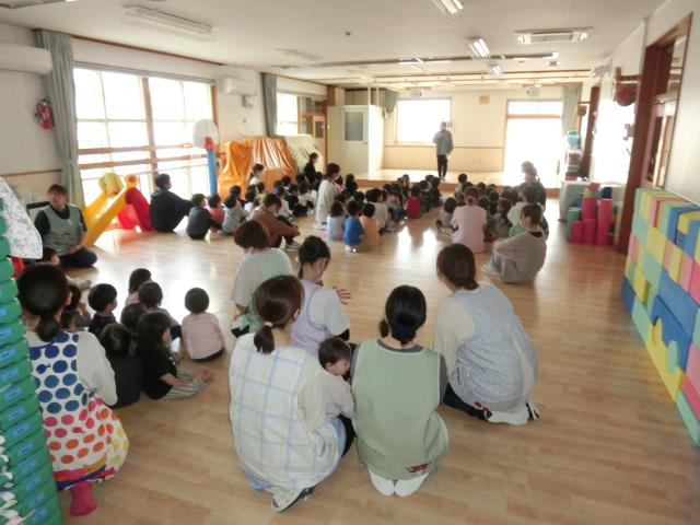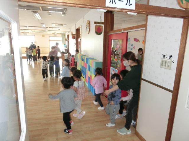初めて参加するお友だちは、ベルの音にビックリしていましたが、先生と一緒に頑張ってホールへ移動していましたよ。