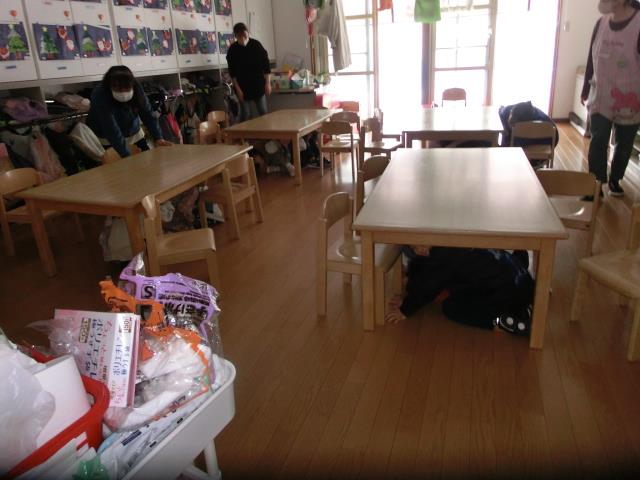 予告なしでしたが、皆先生達のお話をよく聞いて、頭を隠したりテーブルの下へ上手に隠れていました。