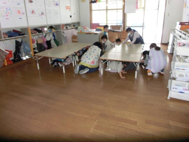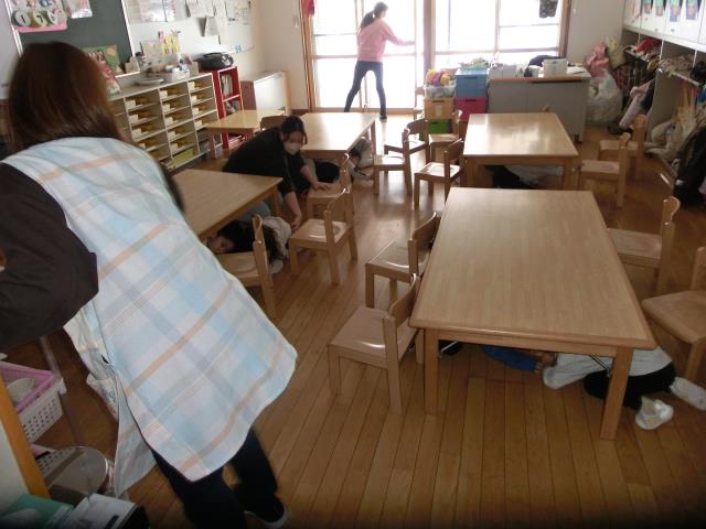 大きいクラスのお友だちはしっかりと頭やお尻もテーブルの下へ入り、自分の身を守る事を実践していましたよ。