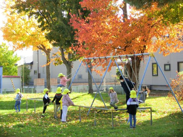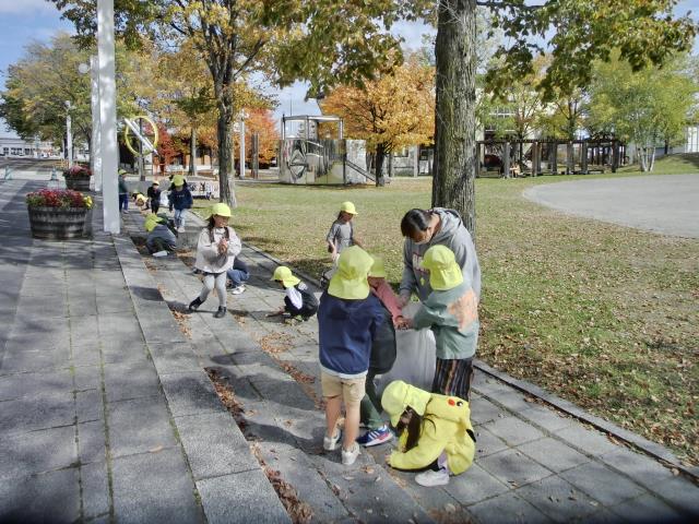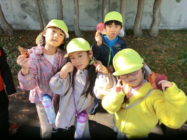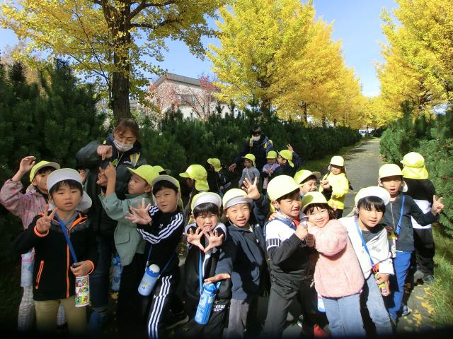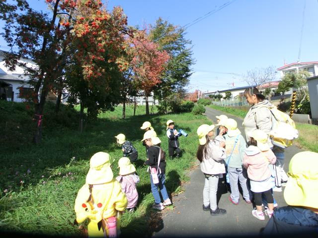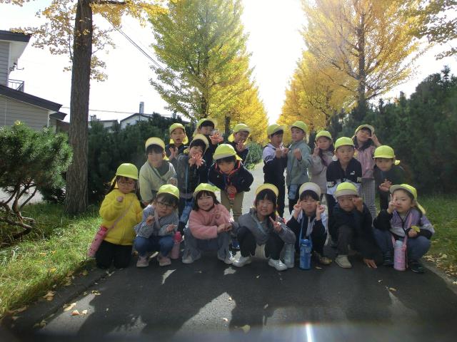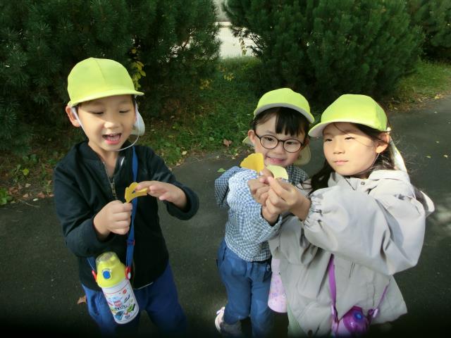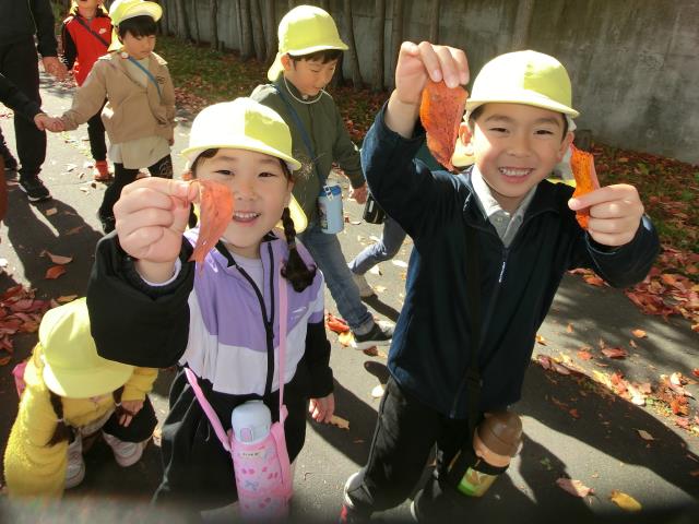 お友達との会話を楽しみながら歩きつつ、緑の葉っぱが赤や黄色に色づいた様子を見たり、銀杏の実を見つけたりと、秋を感じていた子ども達です。