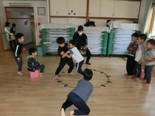 ホールでは、皆が大好きなトランポリンと相撲をして遊びました。