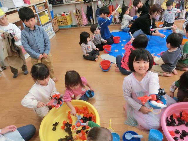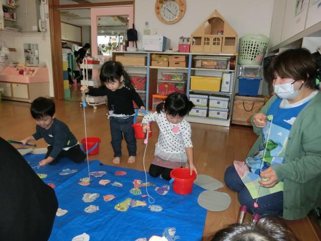 さくら組のお部屋では、魚釣りと金魚すくいをしています。