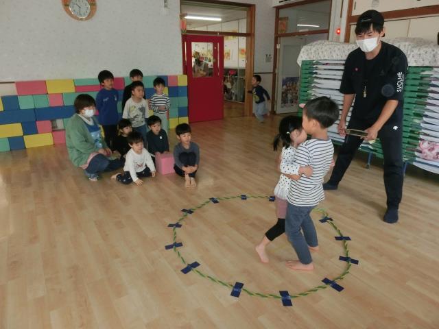 一斉保育中に予告なしでベルが鳴ったため、ビックリした子ども達でしたが、火災であることを放送でしっかりと聞き、先生と一緒に上手に避難することが出来ています。