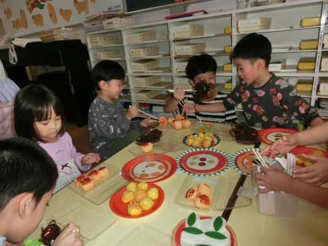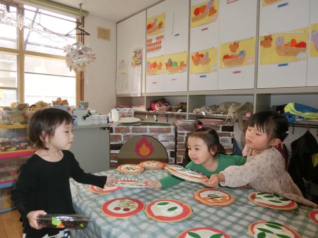 ちゅうりっぷ組のお部屋では、ごっこあそび(食べ物屋さん)をしています。