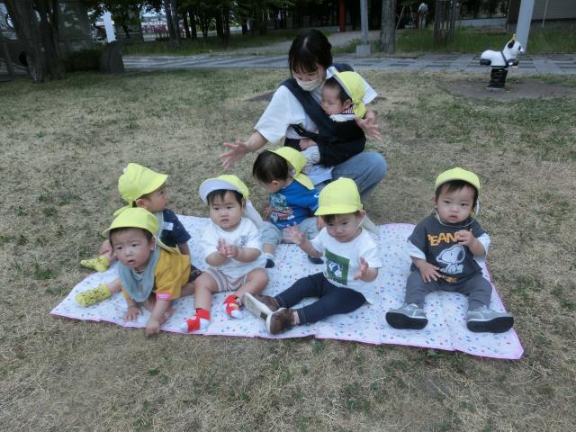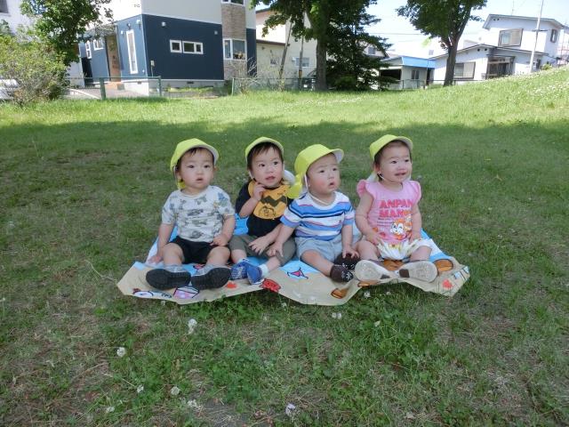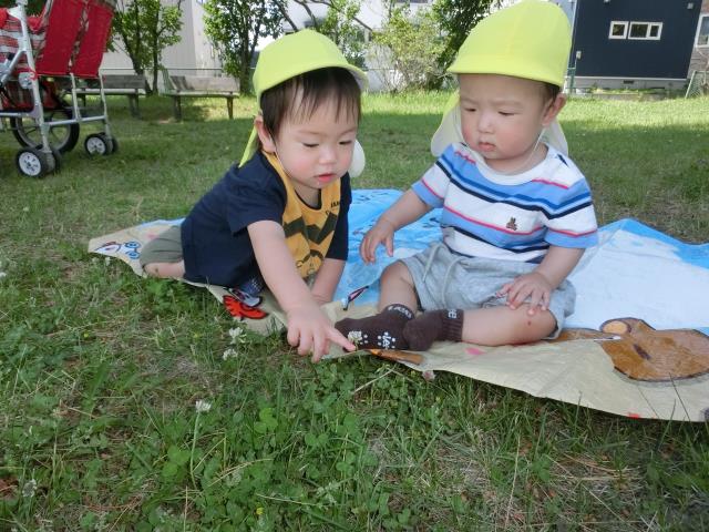 お休みの子が多く少人数でしたが、1人1人が好きな所へ歩いて見たり、レジャーシートに座って、周囲の草花に手を伸ばして感触を楽しみました。