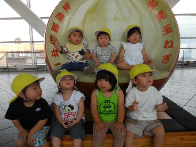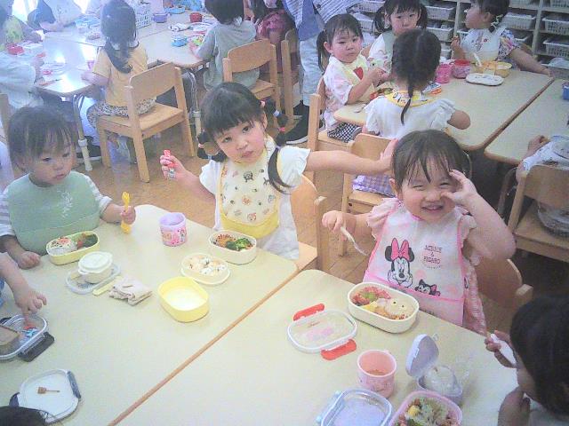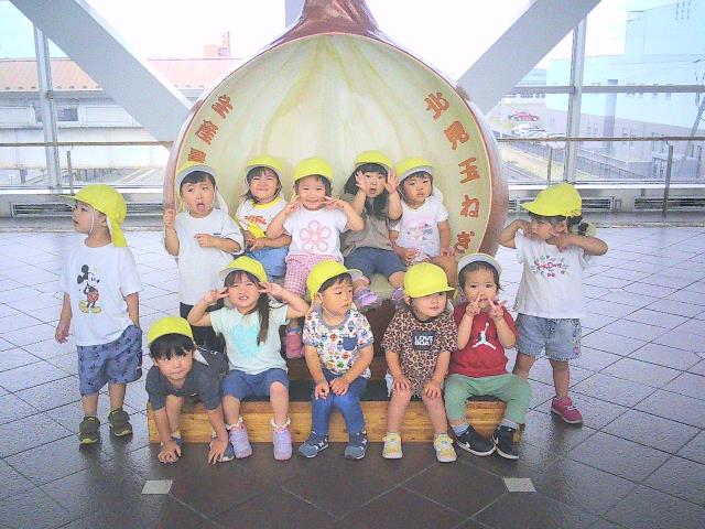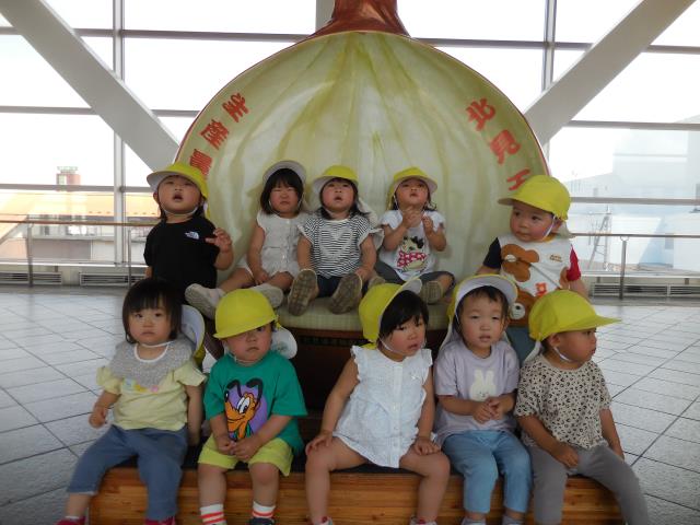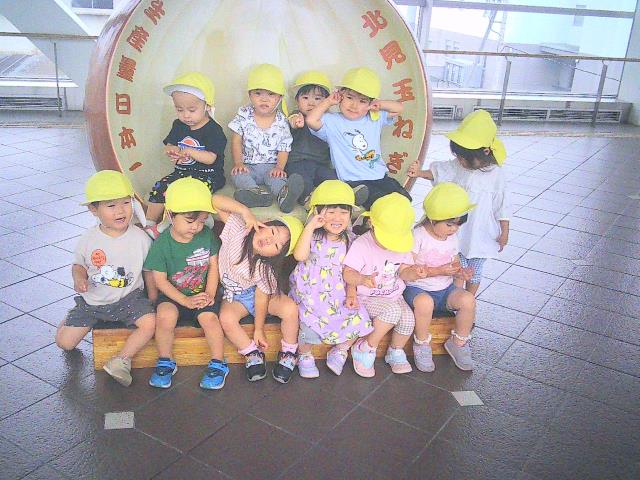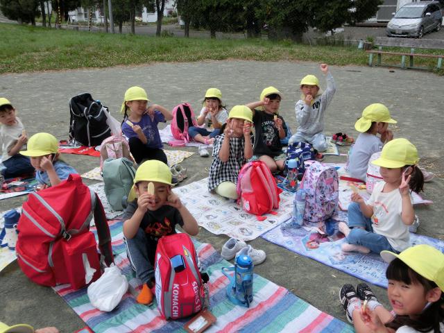 玉ねぎチェアーで記念写真もとり、園に戻ってからは楽しみにしていたお弁当を食べています。
