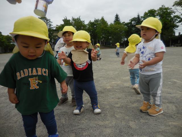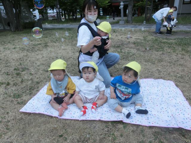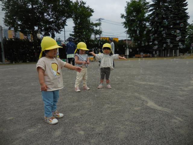 先生がしゃぼん玉を飛ばすと、目で追ったり指差しをしてにこにこのひよこ組さんでした。