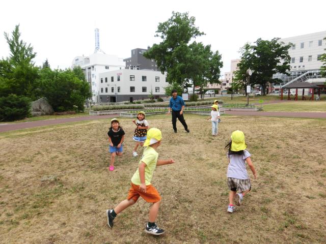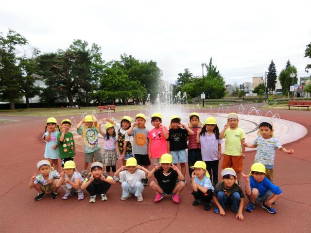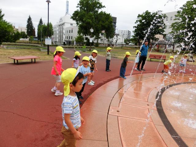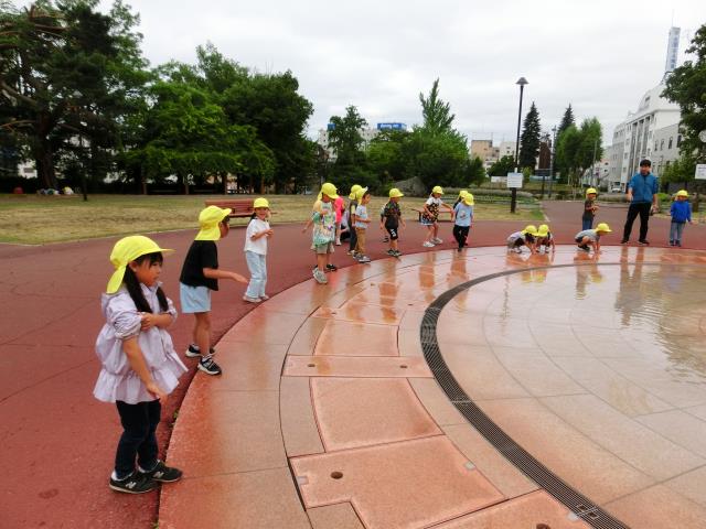 午前中の気温が少し低かった為、予定していた噴水での水遊びはできませんでしたが、噴水の水に触れて遊ぶことが出来、子ども達は大喜び。