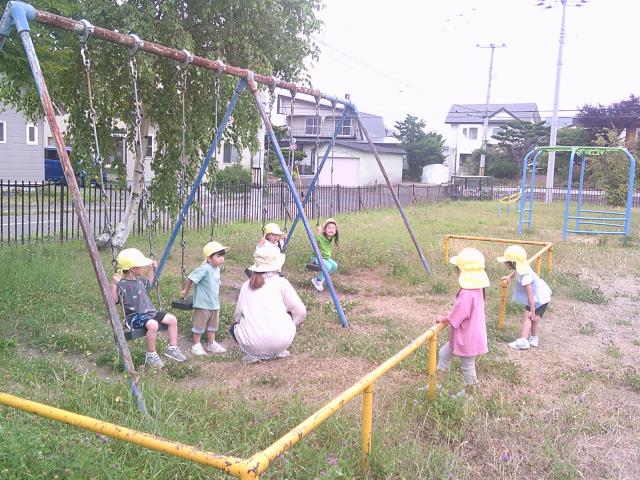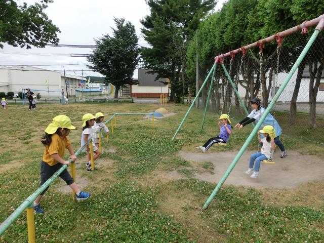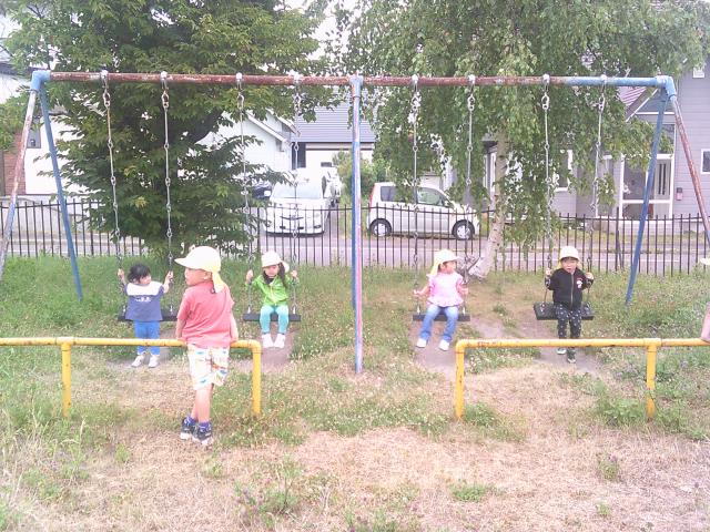 その後は、ブランコ・スイング遊具・すべり台で遊んだり、鬼ごっこをしたりと、好きな遊びを楽しんでいます。