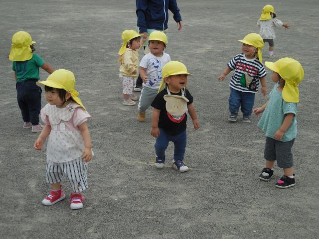 途中から地面の砂が気になり、両手で楽しむ子もいましたが、それぞれ元気いっぱい遊び、お弁当を楽しみに園へ戻ってきています。