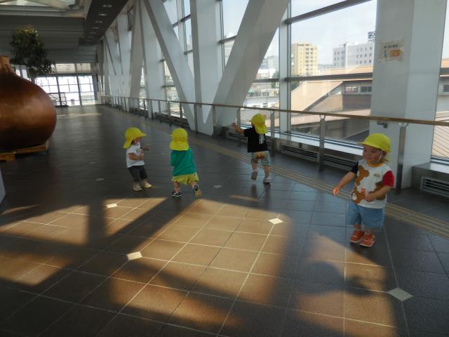 図書館横のスペースから、駅を発車する汽車を見送った後、エレベーターに乗ってプロムナードを散策しています。