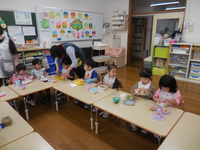 「くいしんぼうのゴリラ」のエプロンシアターでは、バナナやレモンんを食べる様子を興味深く見ていましたよ。
