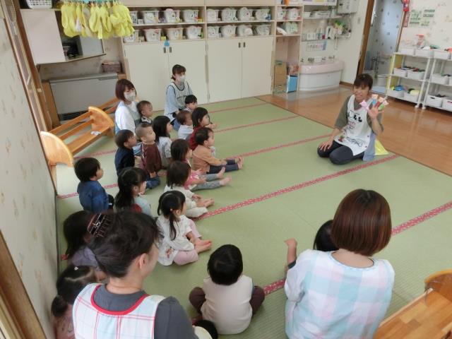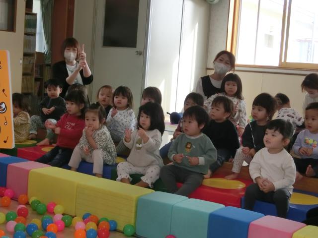 今日のつくしぐみは、園外保育の予定でしたがお天気が良くなかったので、お部屋で出し物を見ています。