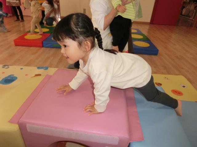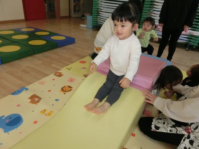 ひよこぐみとつくしぐみのお友達と一緒に、ホールで遊びましたよ。