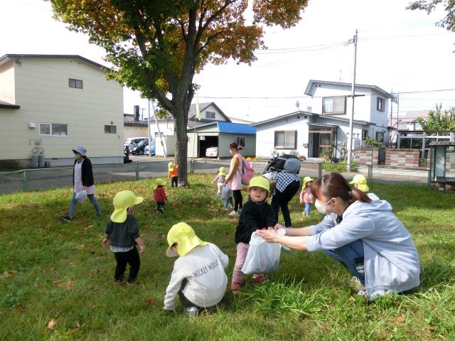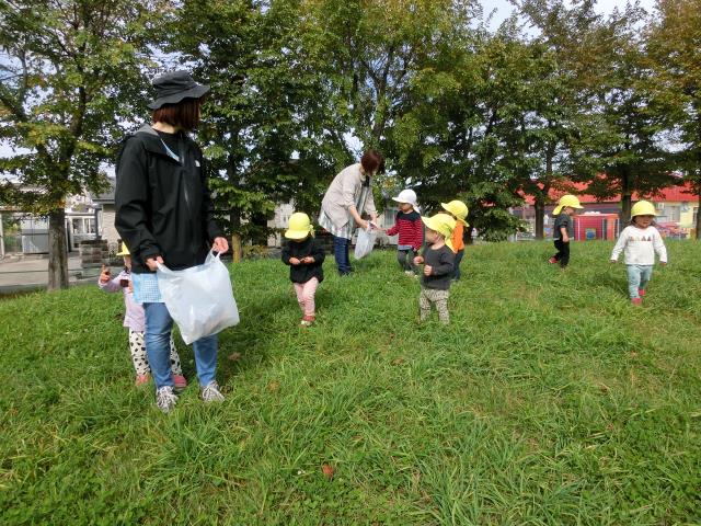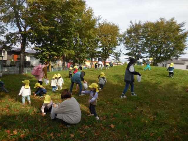 公園では『やきいも』の日に向けて落ち葉拾いを行い、1枚ずつ手に取り、秋の自然に触れながら楽しく過ごしていましたよ!