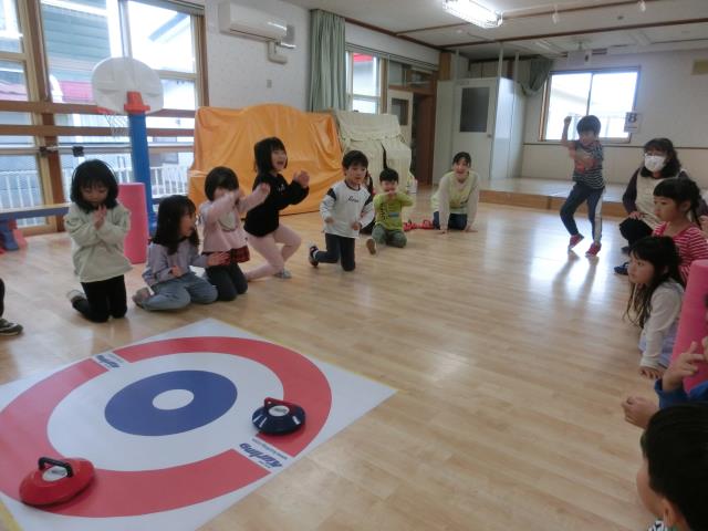 ホールに出て絵合わせ運命ゲームをしたり、カーリングをして遊びました。