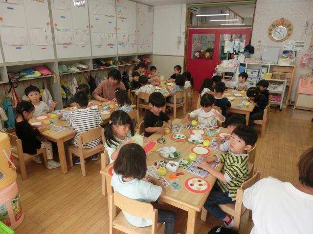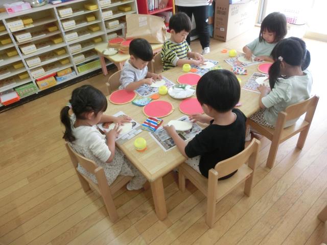 シールを台紙から剥がして貼ったり、先生と一緒に行い好きな所へ貼り、楽しんで取り組めていましたよ!