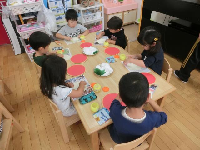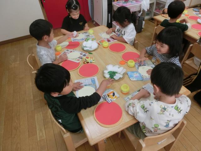 今日のひよこぐみは、9月製作の続きを行い、みんなが作った2つのきのこの顔に目と口のパーツのシールを貼りました。