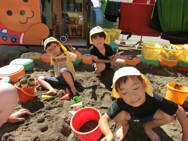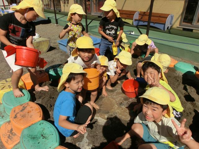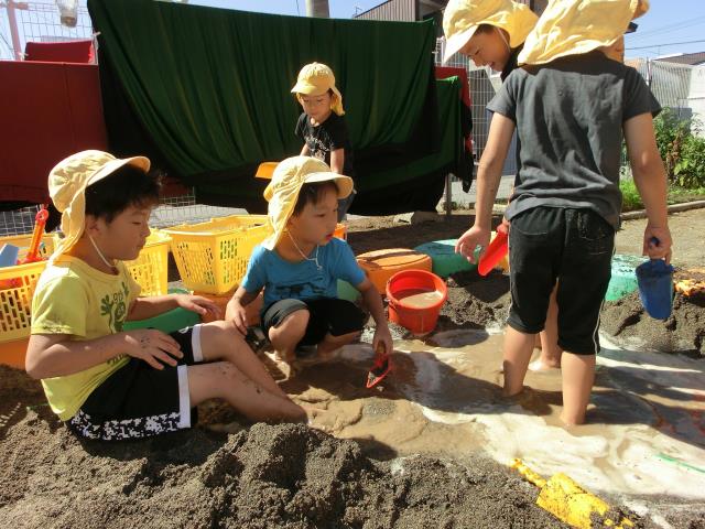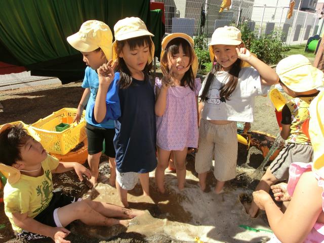 9月とは思えぬ暑さと青空の下で、どろんこ遊びを楽しんだすみれ組です。