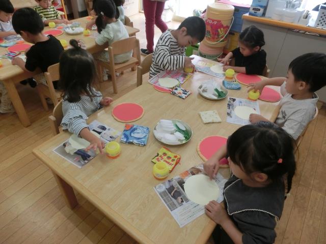 今日のちゅうりっぷぐみは、ごっこあそびの準備でピザ作りをしています。