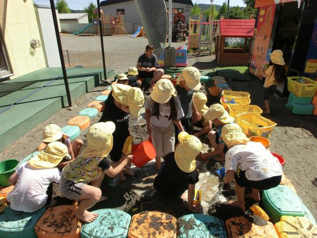 今日のすみれぐみは、9月生まれさんのお誕生会の後、運動会練習でなかなか出来なかった「どろんこあそび」をしています。