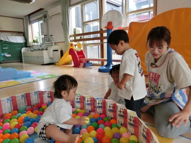 今日は地域支援を行い、ひよこぐみのお友だちと一緒に遊びました。