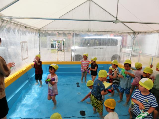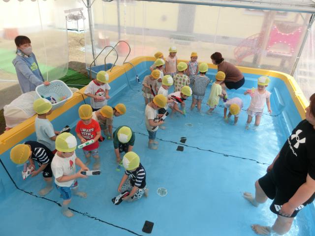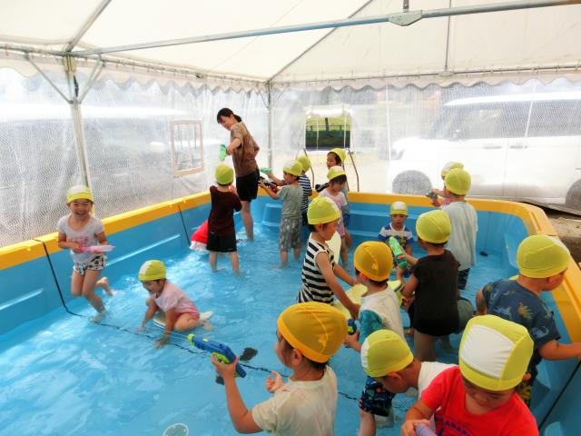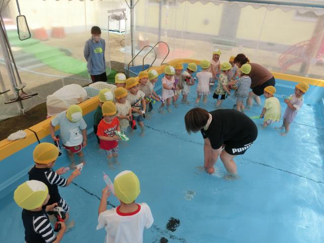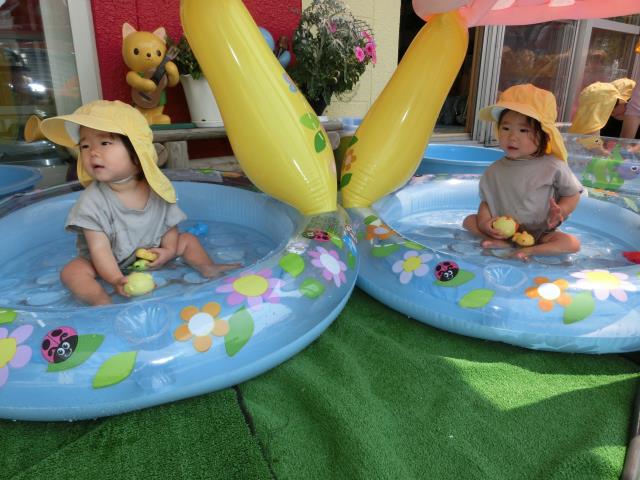 水鉄砲やビート板などを使って遊んだり、水に顔をつけて喜んだり、「キャーキャー」言いながら気持ち良さそうに遊んでいましたよ!