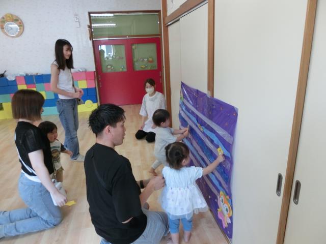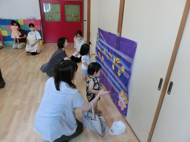 今日のつくし組は保育参観があり、お父さんお母さんと一緒に、ふれあい遊びや体操、七夕ゲームをしています。