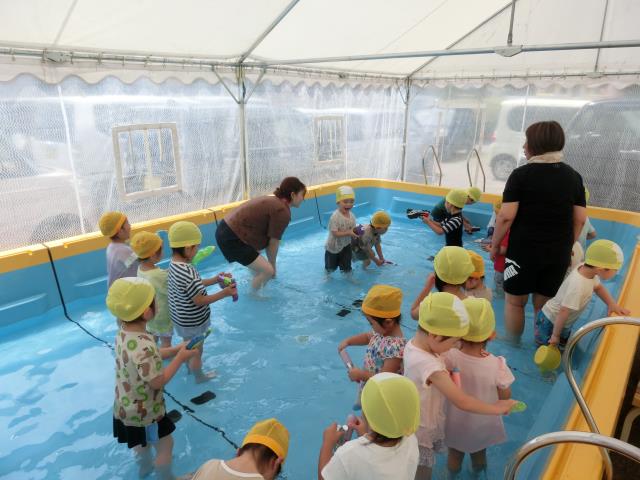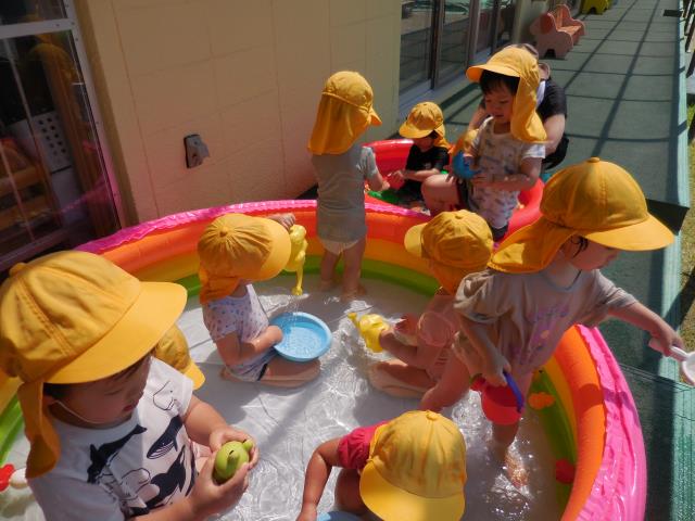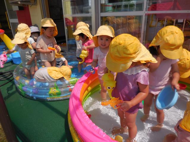 今日のさくらぐみは、今年度初!のプール遊びをしています。