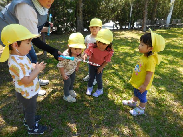 フワフワと飛んでいくしゃぼん玉を、小さいクラスのお友だちは窓から見て喜んでいました。