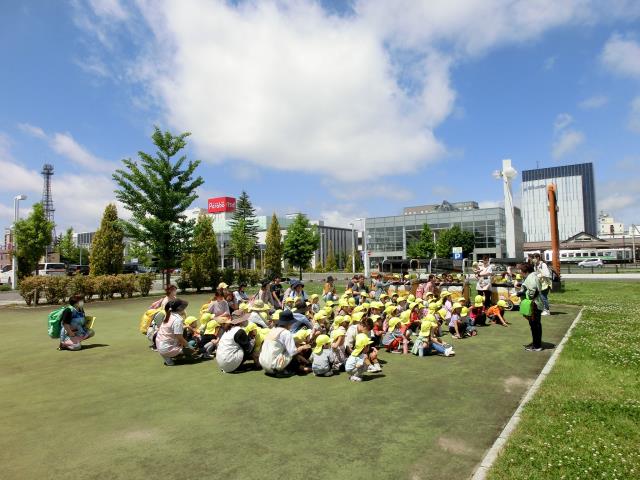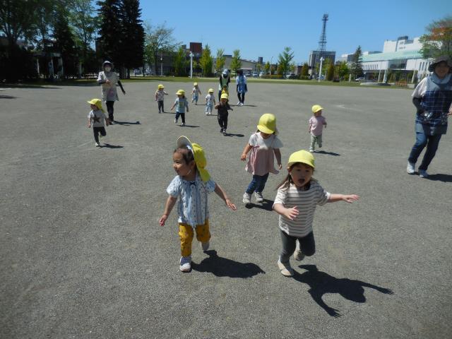 今日のたんぽぽぐみは、ひまわりぐみのお友だちと一緒に芸文前広場まで行ってきました。