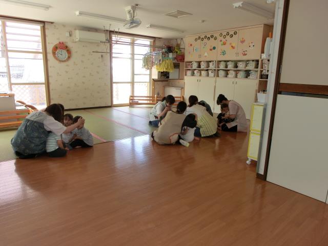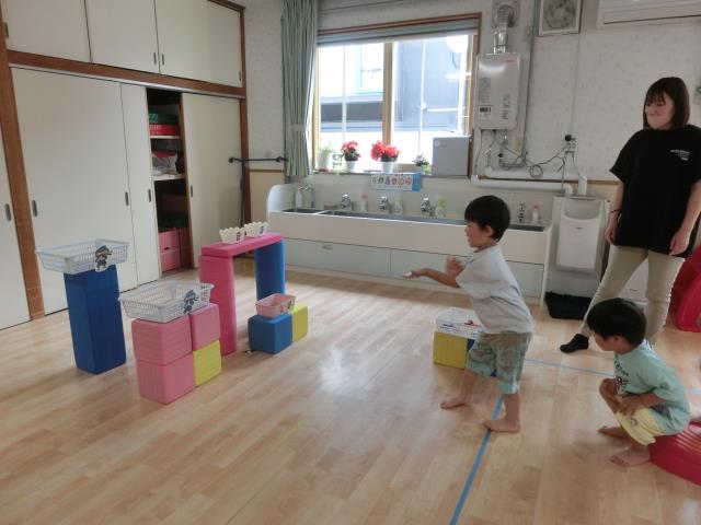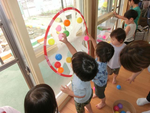 すみれぐみのお部屋では、小さいお友だちに大人気のボールプールやボール落としなどがあり、夢中になって遊んでいました。