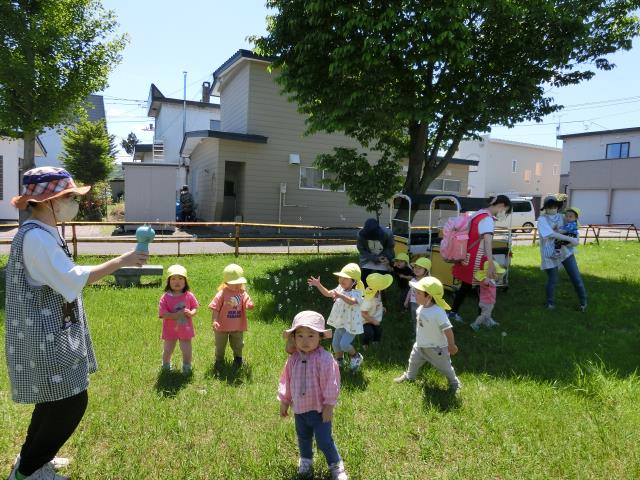 公園ではひまわりぐみのお友だちも一緒に、たくさんのしゃぼん玉に触れたり、追いかけたりして遊んでいます。