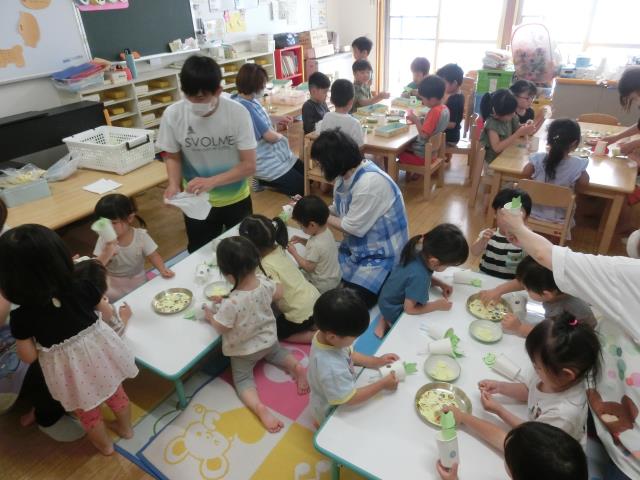ちゅうりっぷ組のお部屋では製作を行い、小さいお友だちは『ゲコゲコガエル』大きいお友だちは『飛ぶロケット』を作っています。