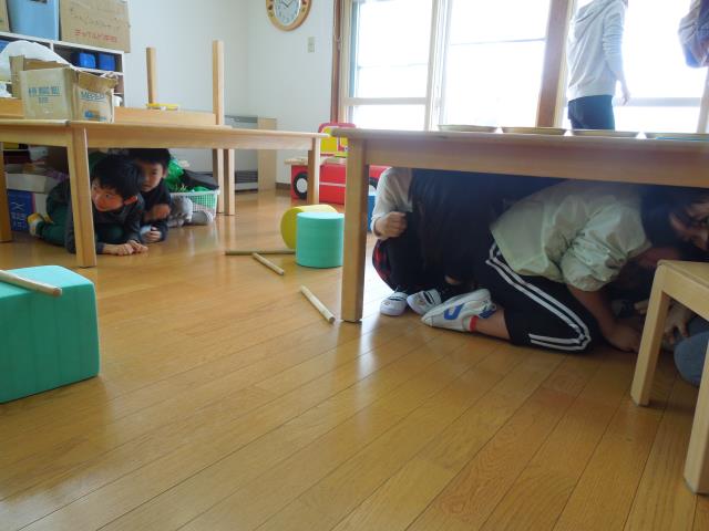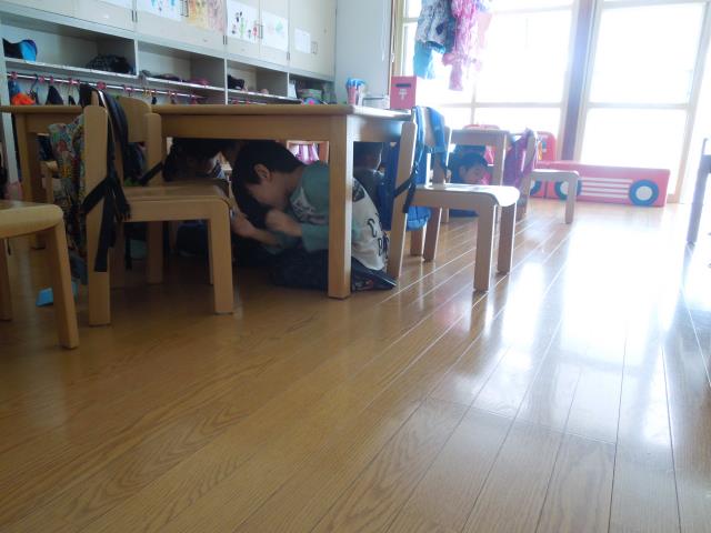 予告なしという事で驚いて泣いてしまったお友達もいましたが、先生方の話をしっかり聞いた後、テーブルの下等に避難出来ましたよ。