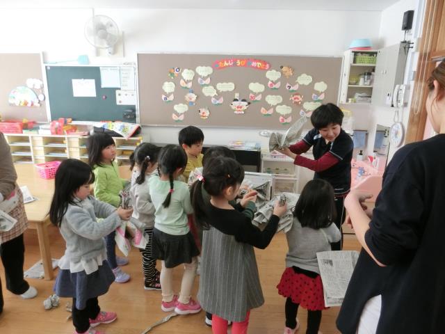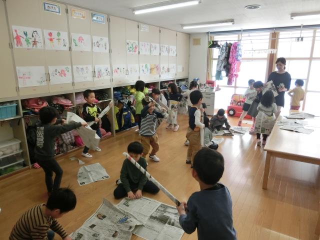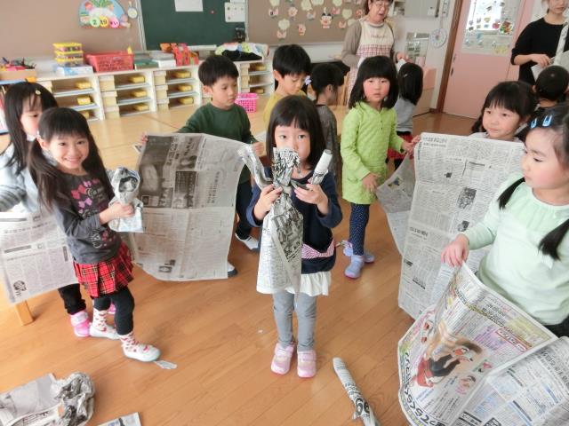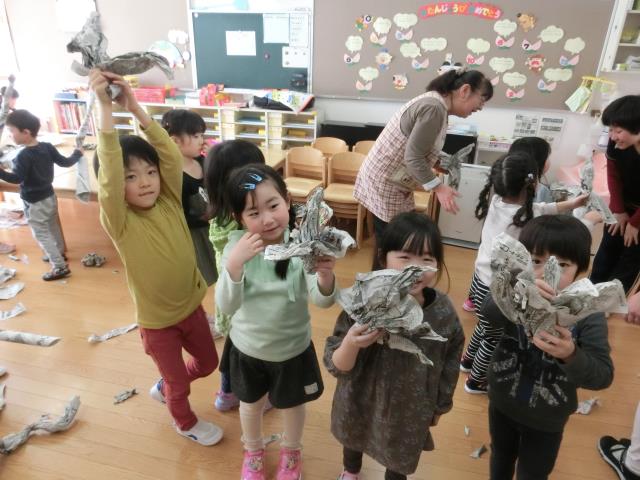 さくら組は観劇の後、新聞紙あそびが面白かった様子でクラスへ戻ってすぐにあそび始めました。