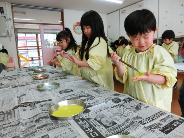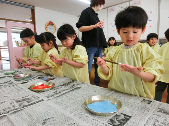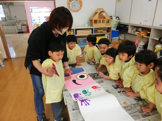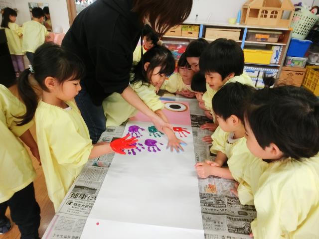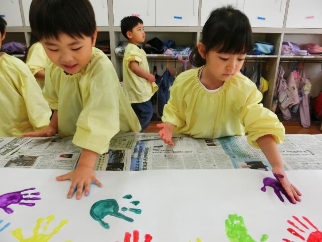 手の平に絵の具を塗ると「きもちい~!」「くすぐったい」などと言いながらも、嬉しそうな表情をしていました。
