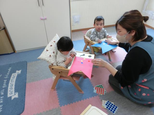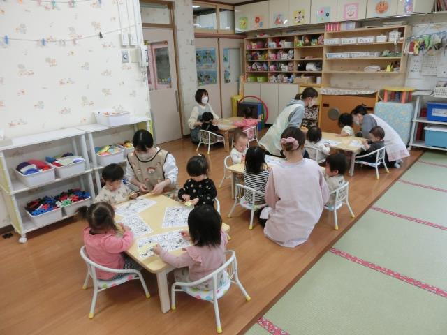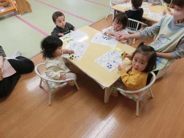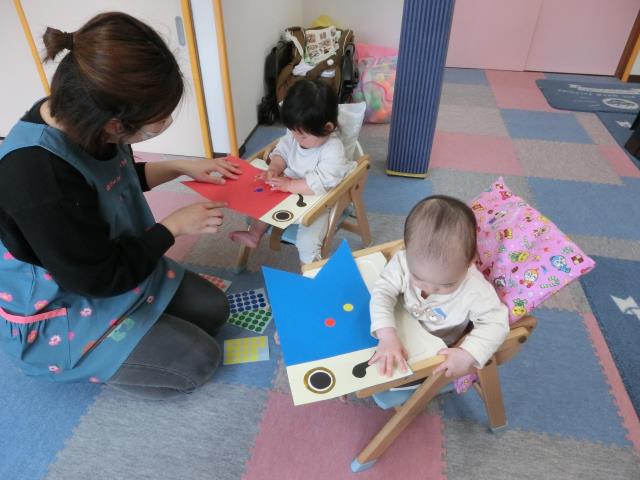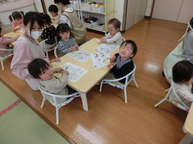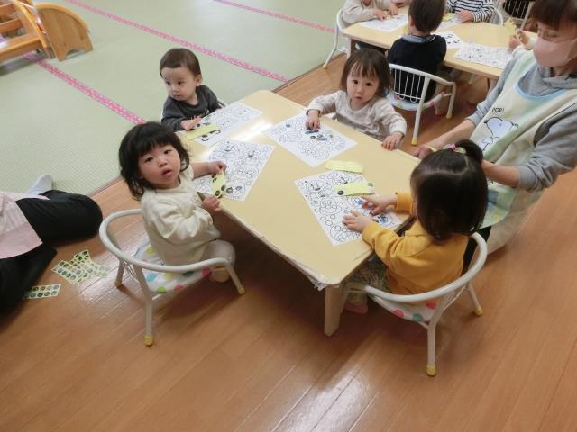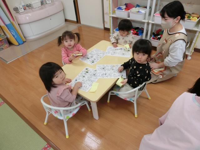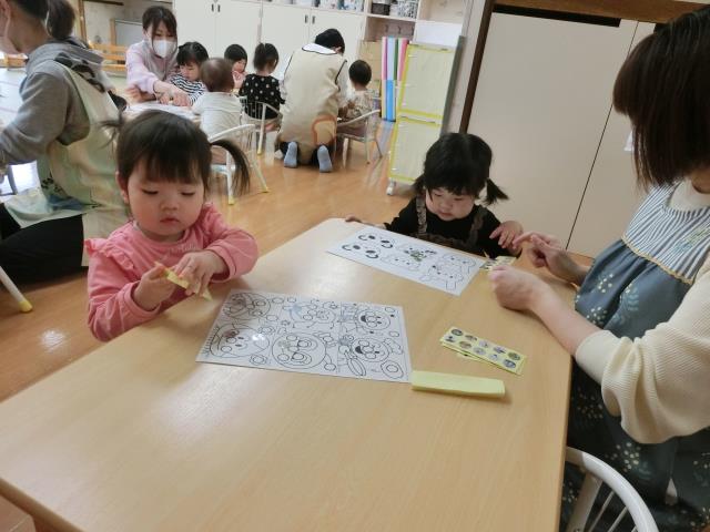 今日のつくしぐみは、シール貼り遊びをしています。
