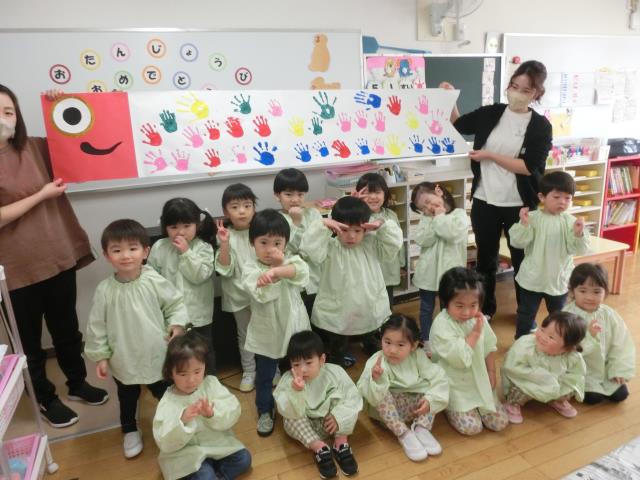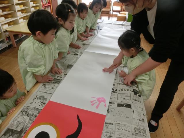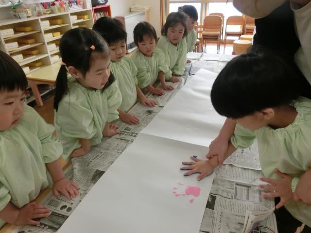 お友だちがつけていく手型を見て「うわ~!」「すごーい!!」と興奮していた子ども達。