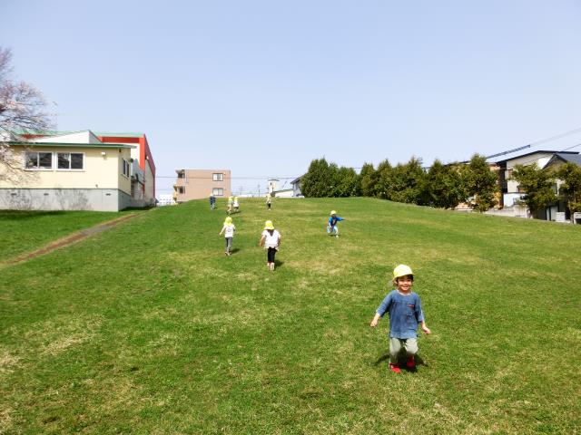 ひろ~い公園の中を、鬼ごっこをして元気に走りまわったり、山の上から転がったり、ブランコや滑り台などの遊具でも楽しく遊んでいました♪