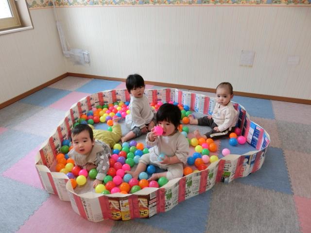 シール貼りの後は、牛乳パックサークルのボールプールで遊び、ボールを投げたり転がしたりと、思い思いに楽しんでいましたよ!!