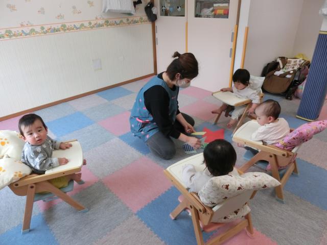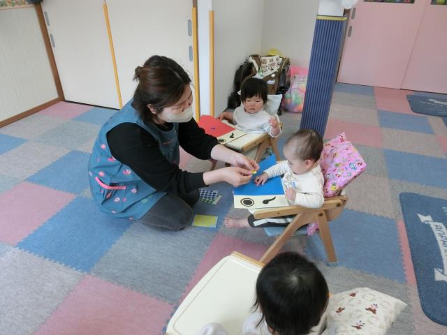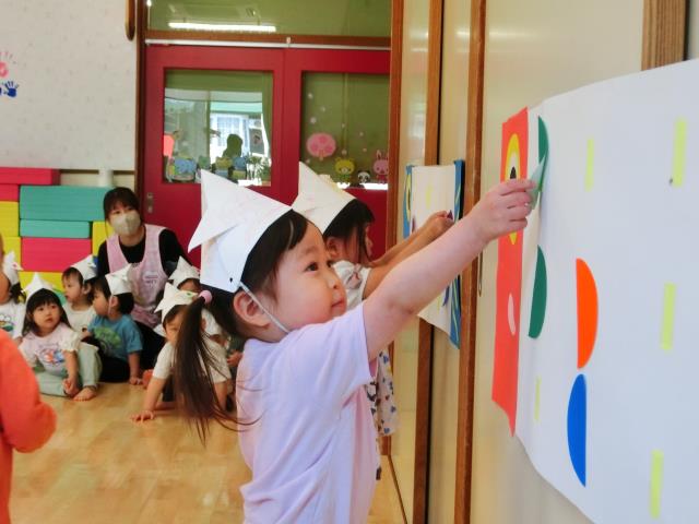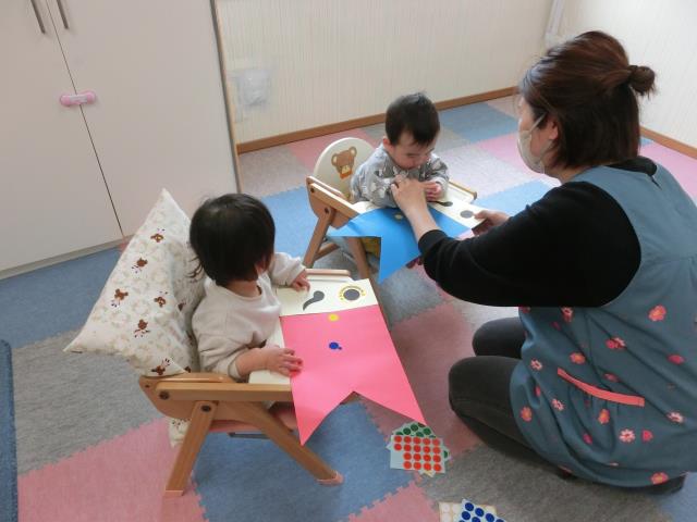 今日のひよこぐみは、子どもの日の集いで行うゲームのトンネルに飾るこいのぼりに、一人ひとりがシールを貼っています。