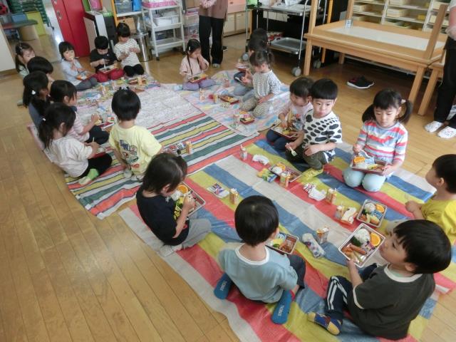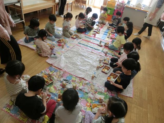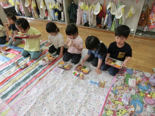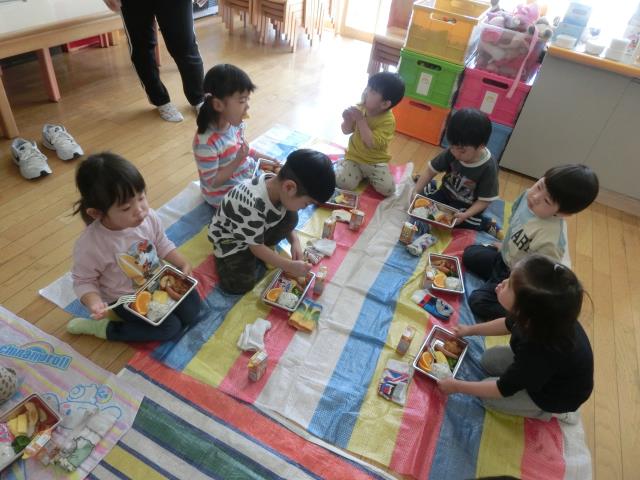 戻ってきてからはお部屋にシートを敷いて、お花見弁当を食べています。