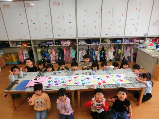 好きな色を選び、みんなの手型を押してウロコにしています!