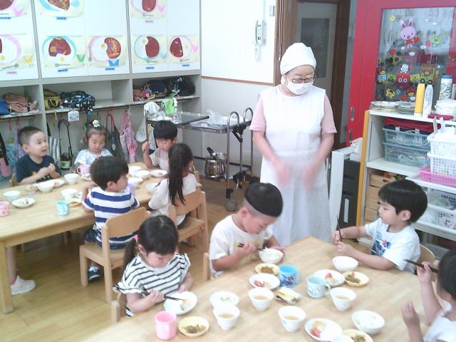いつも給食を作ってくれている方だよと紹介すると、いつも以上にもりもり食べて、アピールしていた子ども達!!