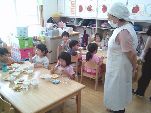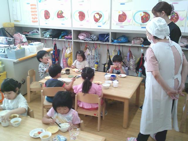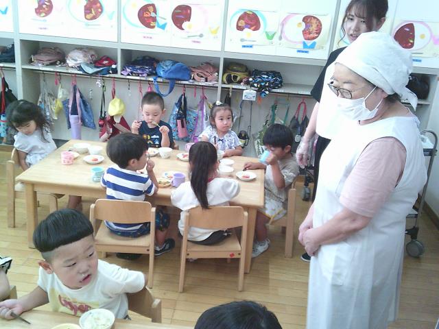 今日はちゅうりっぷぐみのお部屋に、調理員さんが給食を食べている様子を見に来てくれました!